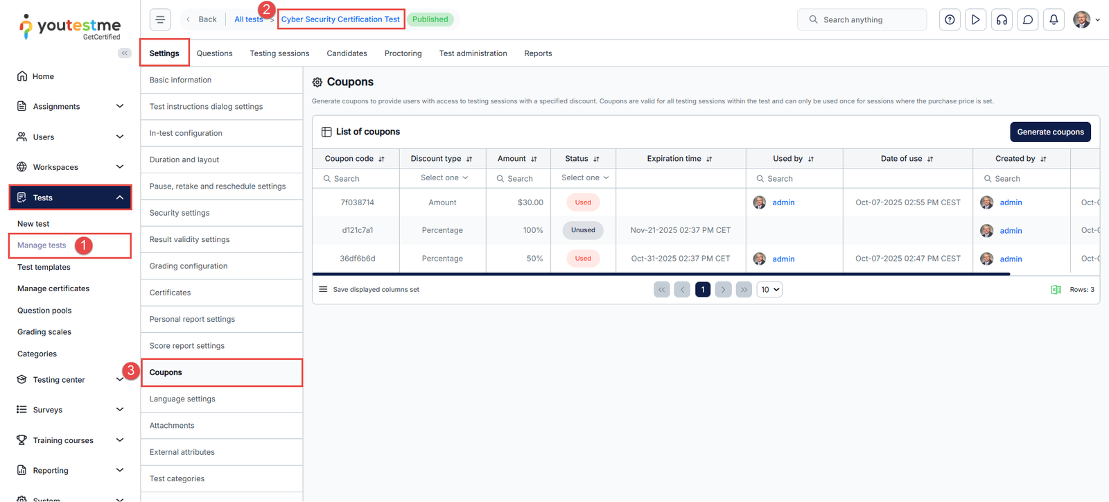 - The candidate’s username, who redeemed the coupon, can be displayed in the ‘Used by’ column.
