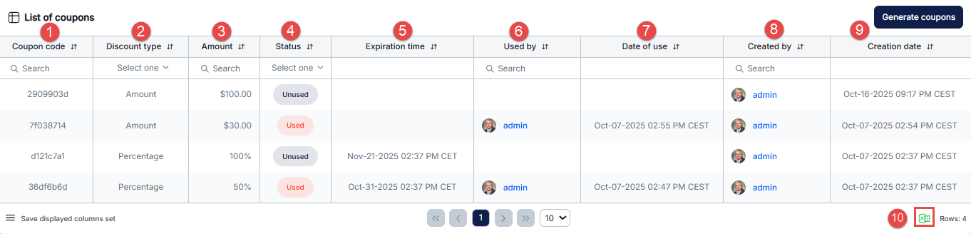 - The coupons can be exported to an Excel file using the buttons in the lower right corner.