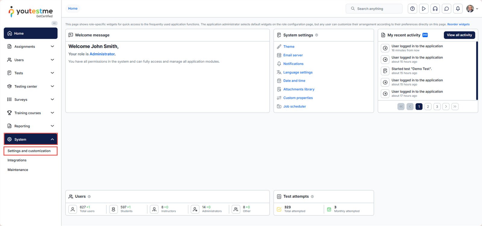 To access the Language bundles settings, navigate to the System module in the main menu and select the Settings and customization option.