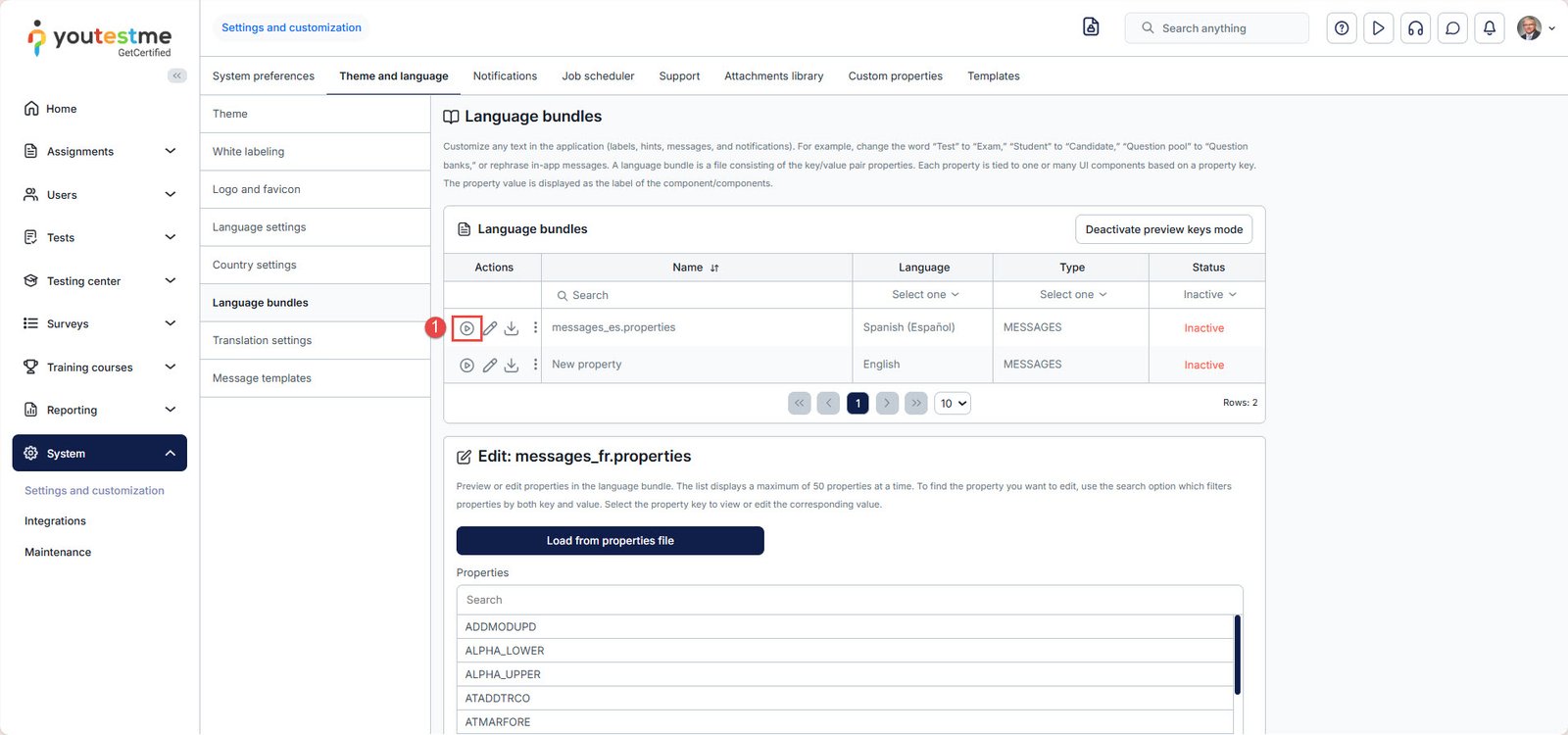 - Changing the language bundle by editing one-by-one property values.