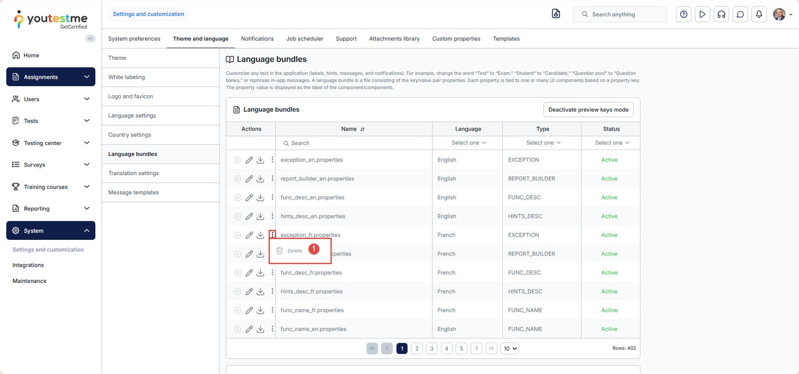 You can reactivate the default language bundle at any time. If you want to delete a custom language bundle: