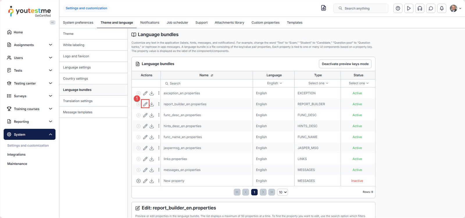 To easily find the desired property value, you can use the preview keys mode by clicking on the Activate preview keys mode button at the top of the language bundle table.