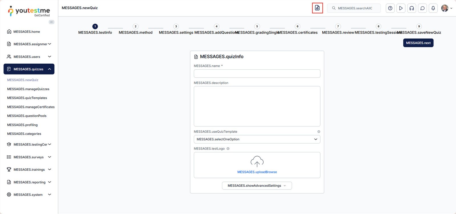 After the mode is activated, select the key icon at the top of the page to view the desired property value and identify the language bundle to which it belongs.