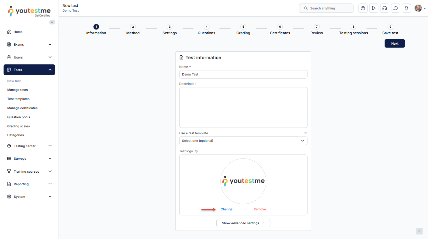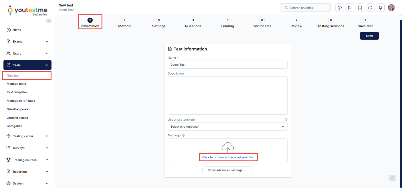 You can set the test logo while creating a new test. To do this:
