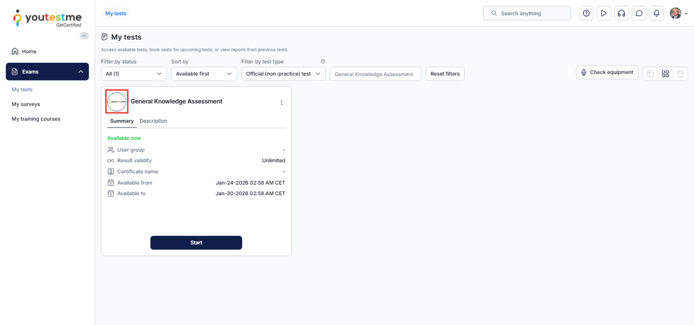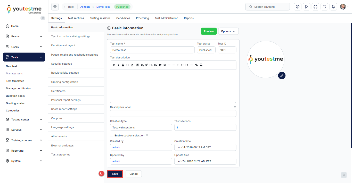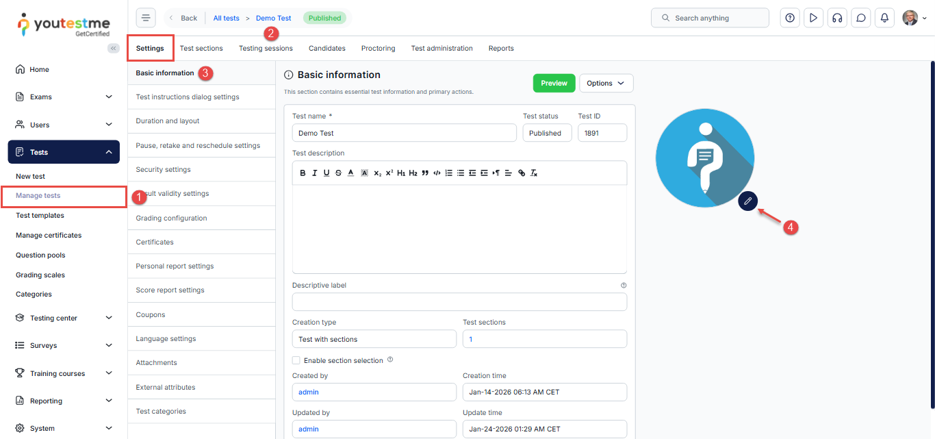 If you don’t set a test logo during test creation, the system will assign a default logo. You can change this logo at any time from the test settings.