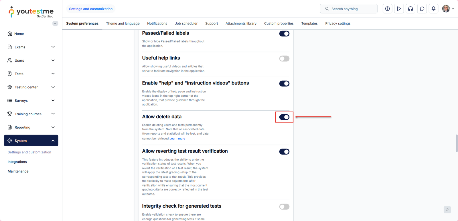 How to enable data deletion in the system