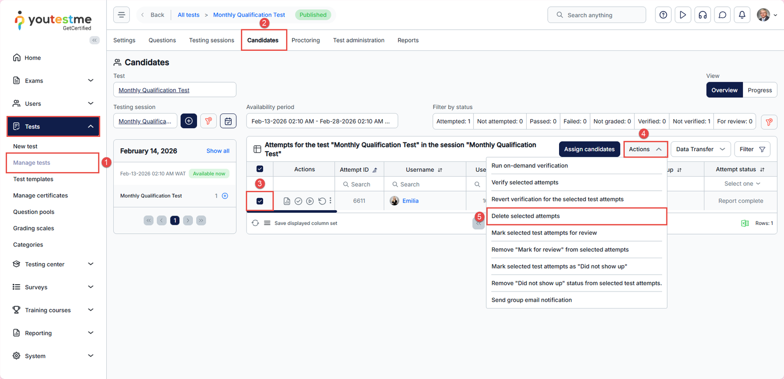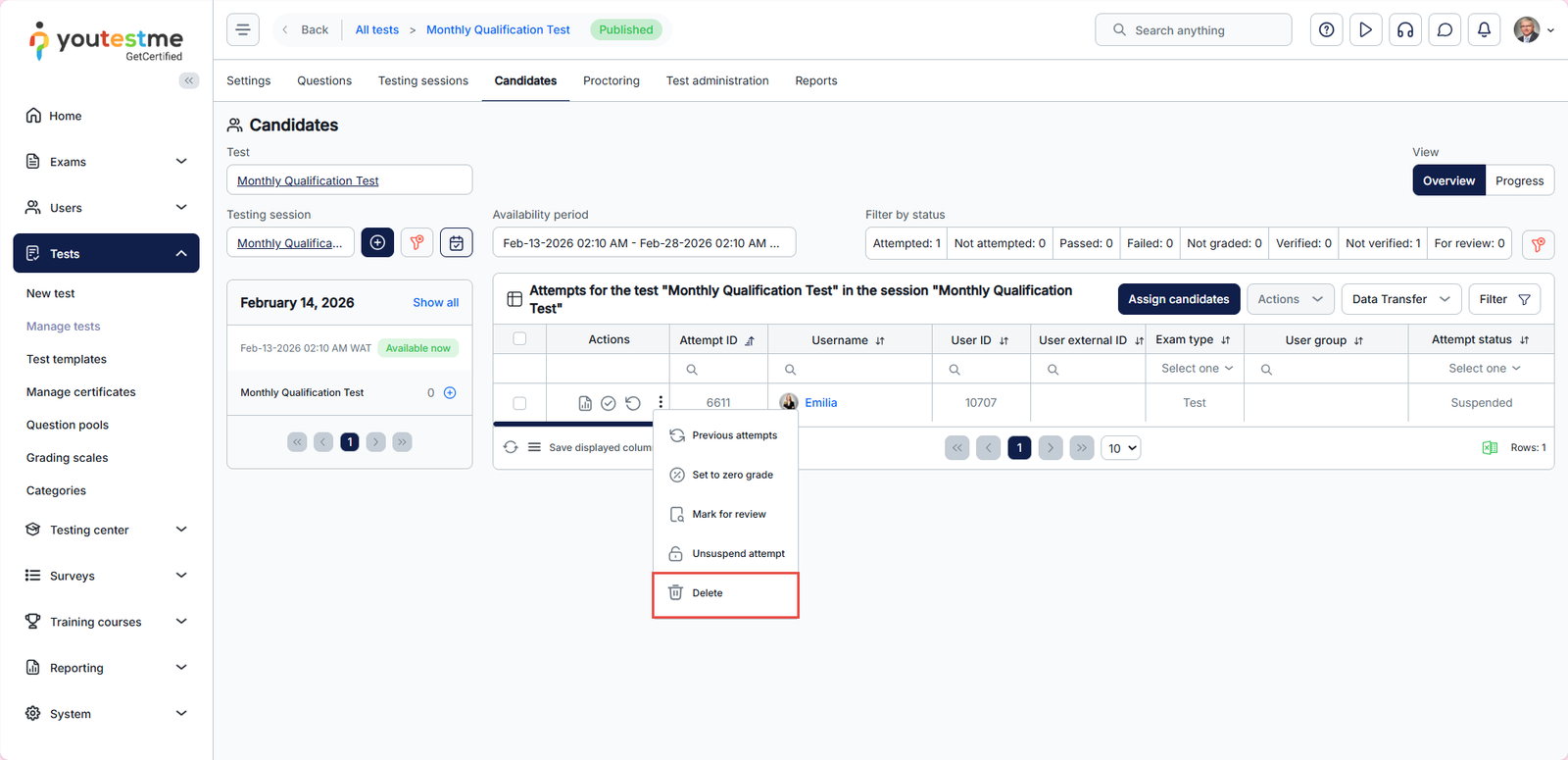 This article explains how to delete a test attempt in your system, whether it’s a regular or suspended attempt. Deleting an attempt can be useful if a candidate submitted a test by mistake, if the attempt contains errors, or if you need to reset the test for another try.