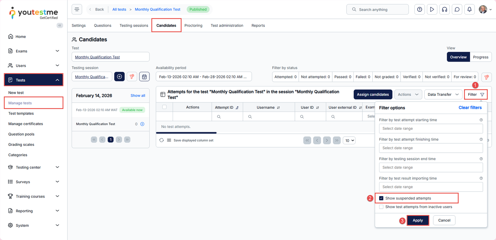 - Enable Show suspended attempts.