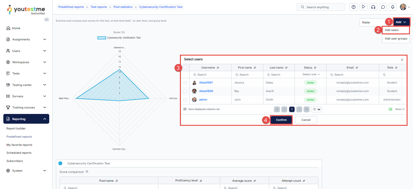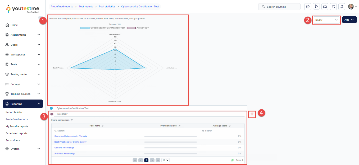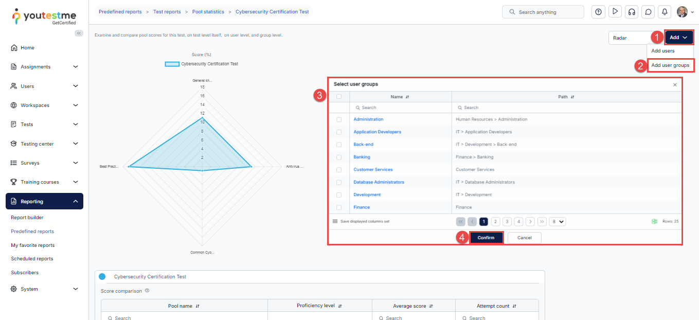 - On the chart, the average score of all the user groups we’ve added is now displayed for each question pool.