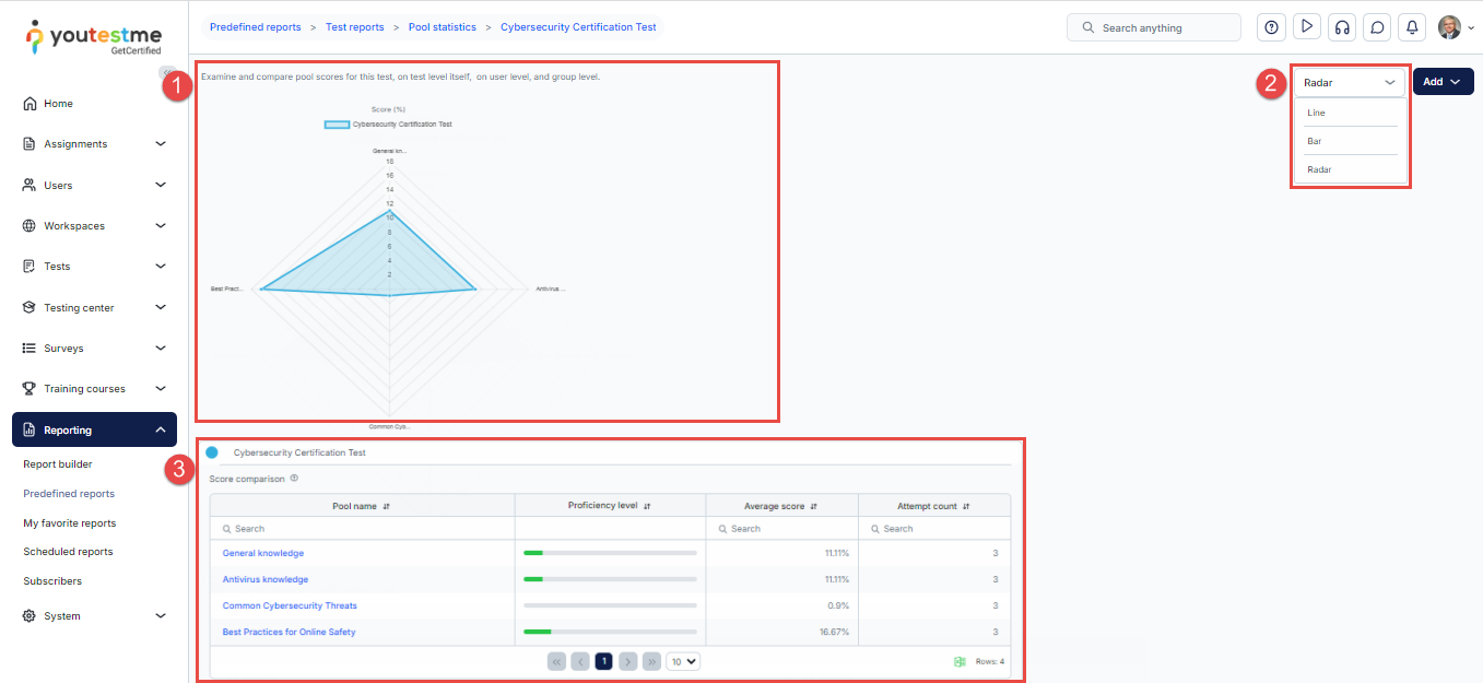- You will immediately view a chart comparing question pools and average scores based on all completed test attempts.