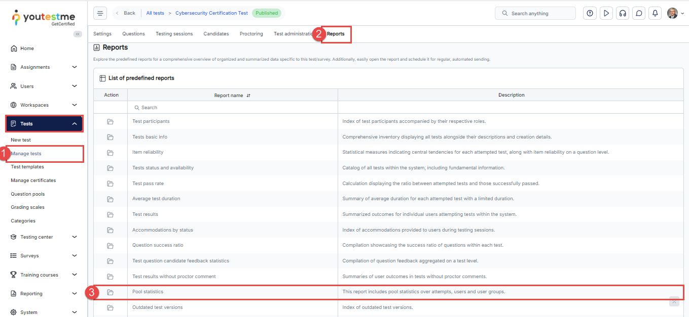 - Go to the Tests/Manage tests tab and select the desired test by clicking on its name.