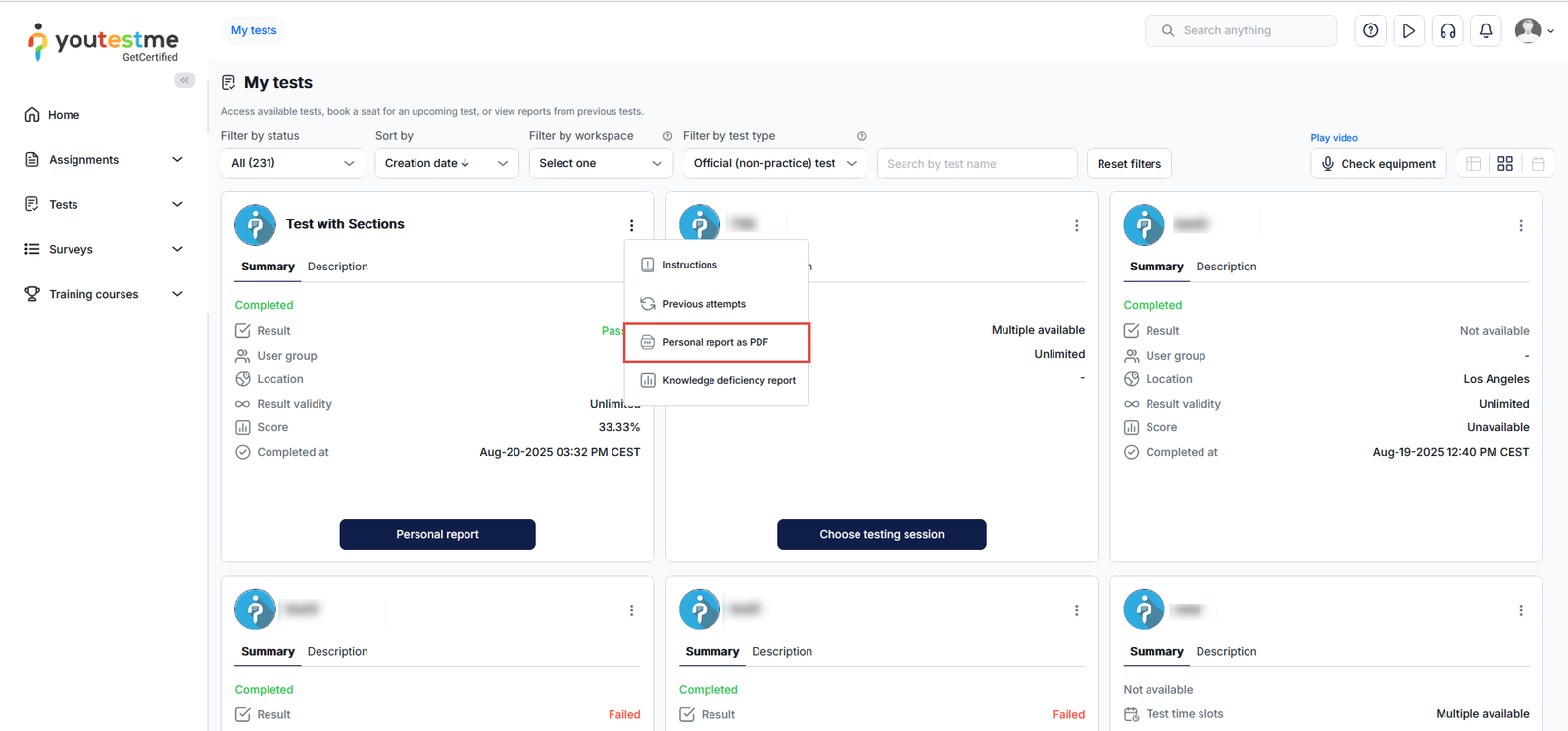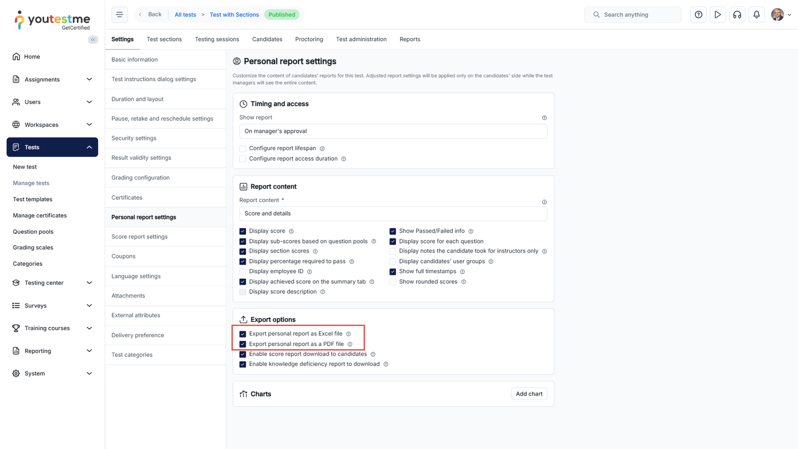 The candidate can also export their report directly from the Personal Report page, as shown in the screenshot below. To see how to access the Personal Report page, please refer to this article.