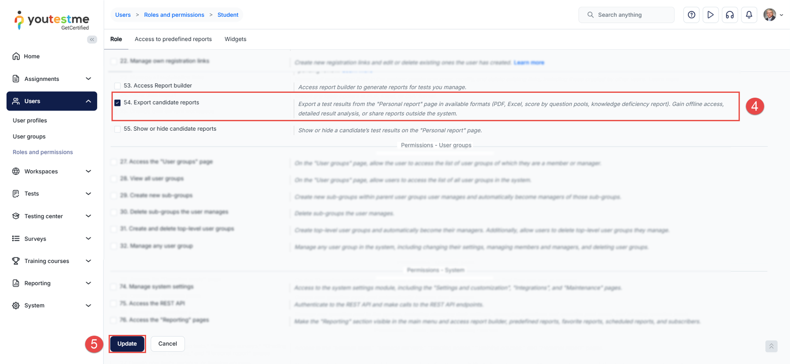 The export options (PDF and Excel) are only available if the Export candidate reports permission is enabled for the user’s role. To enable this permission: