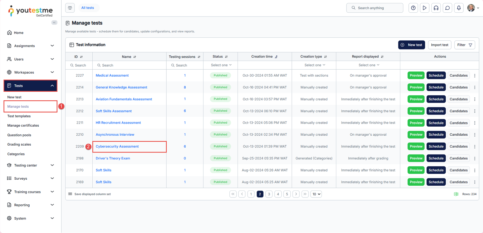 1. Hover over the Tests tab in the main menu. Click on the Manage Tests tab