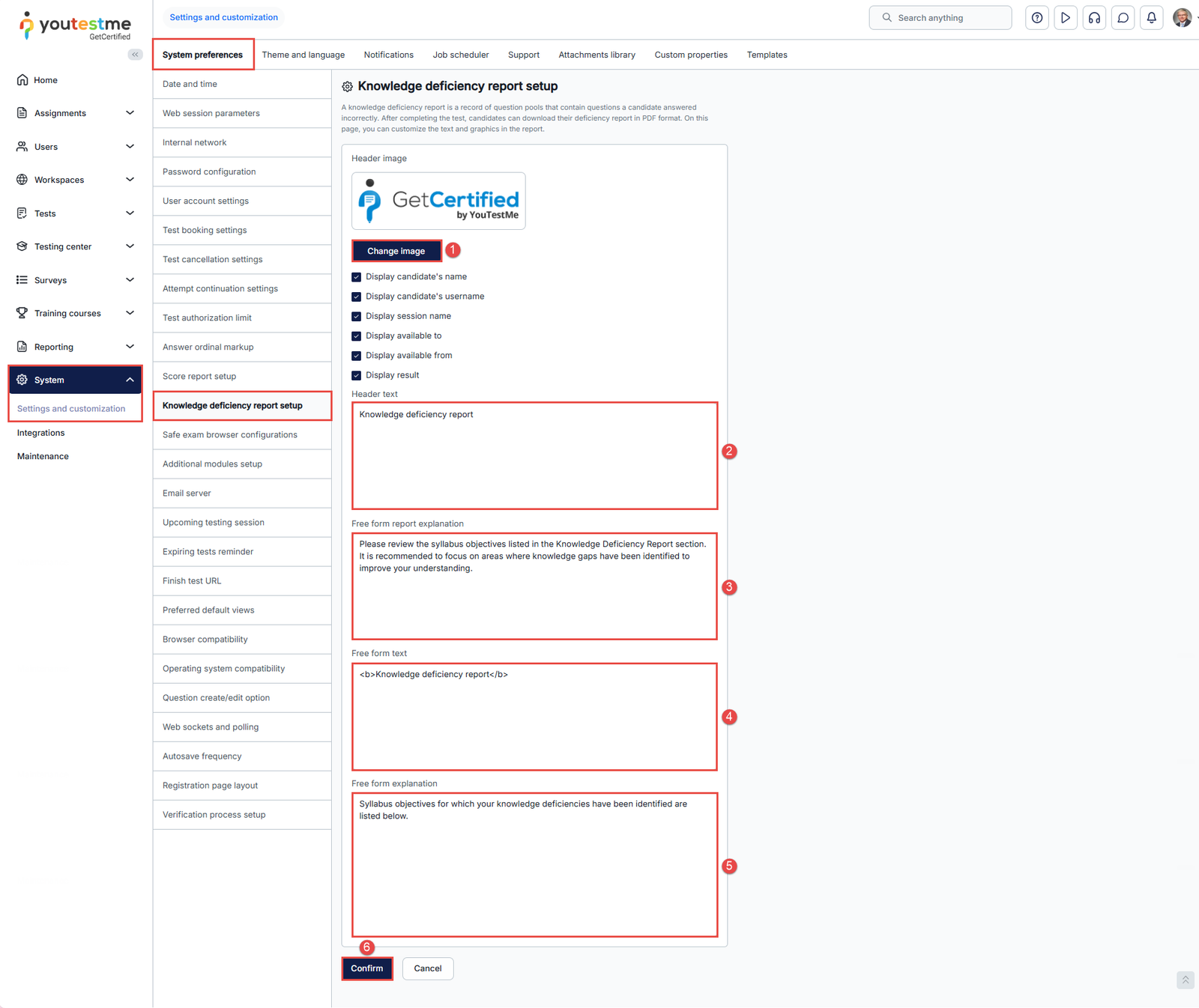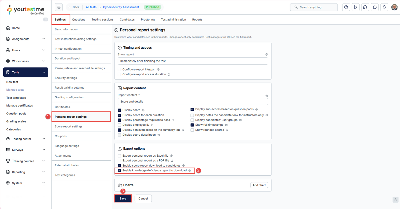 Enabling the download of the “Knowledge deficiency report” in the test