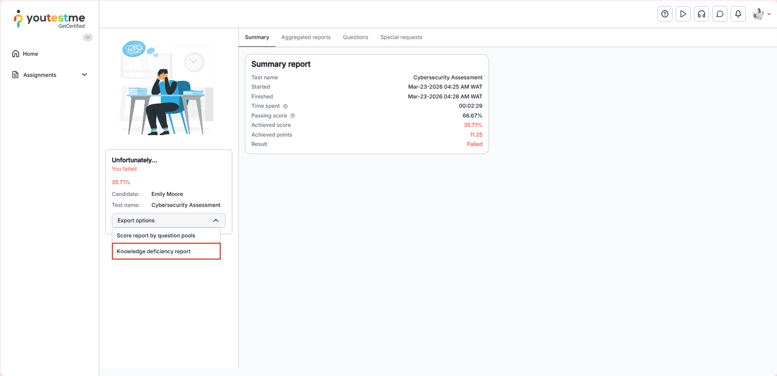 When a candidate finishes the test, in their Personal report, the Export button option should appear, offering all enabled reports for downloading. Among them, the Knowledge Deficiency Report will be listed.