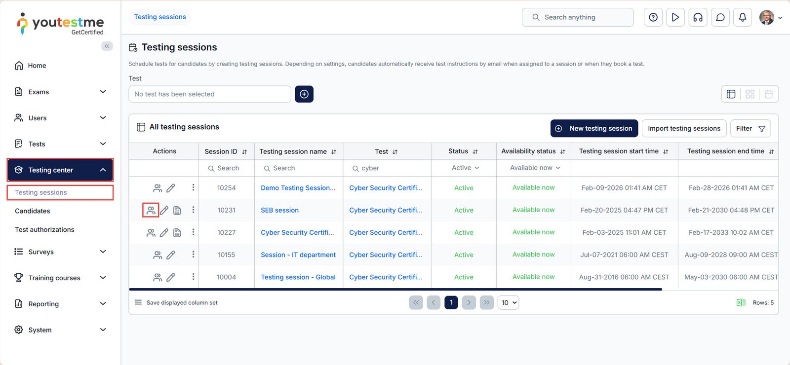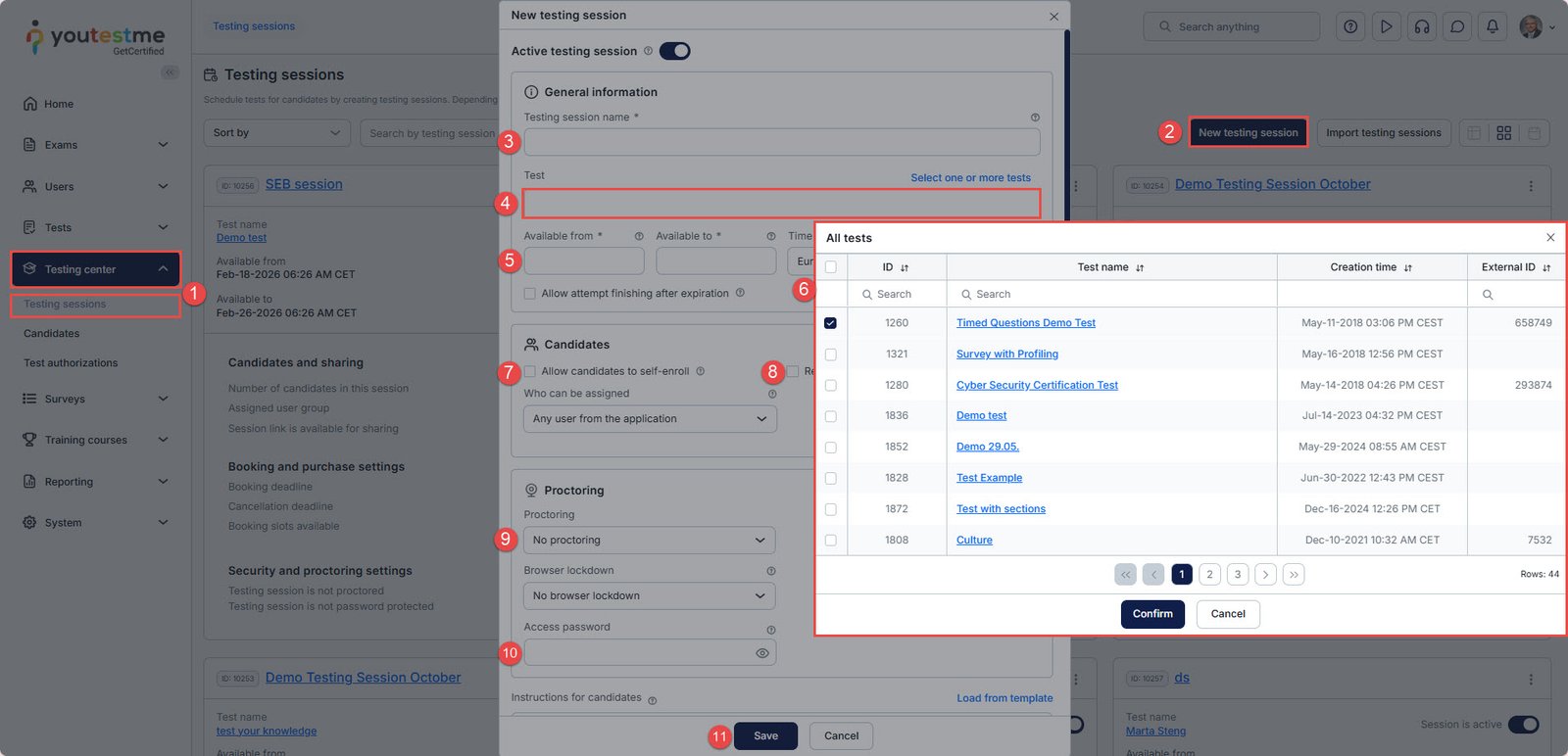 To create a single test session through the testing session dashboard, navigate to the Testing center page in the left-side menu and:
