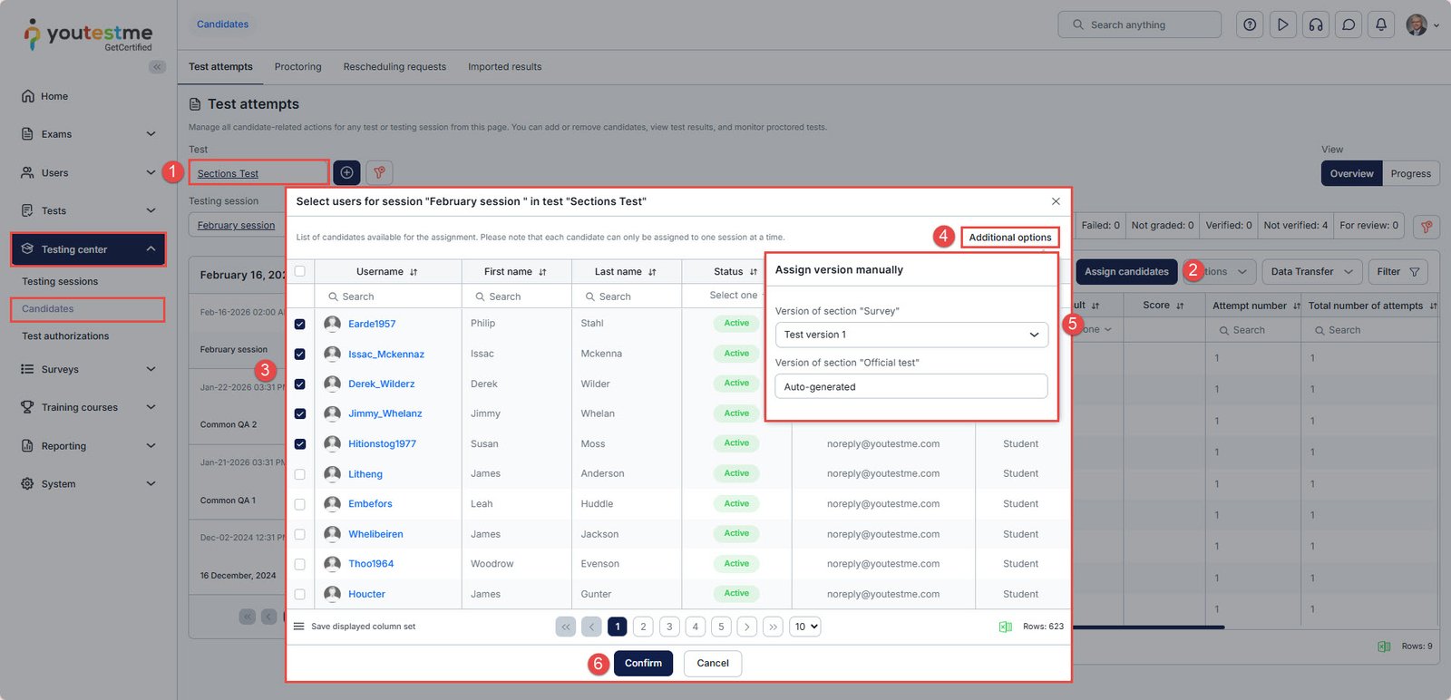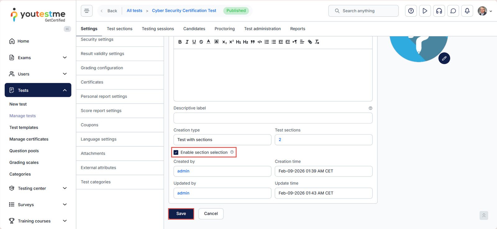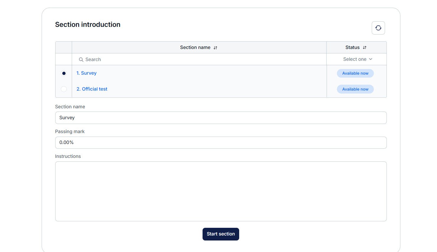 Section selection allows test managers to control which test sections are available to specific candidates based on predefined conditions or manual assignment. When this feature is enabled, candidates will only see and access the sections they are eligible for when starting or booking a test.