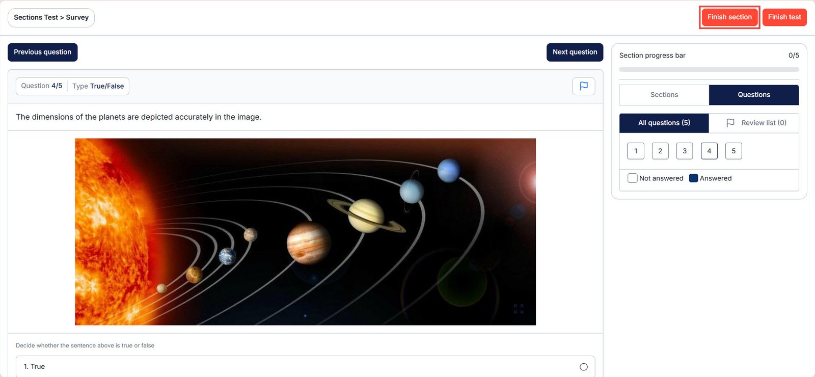 Once the candidate finishes answering the questions in a section, they can proceed to conclude the section using the Finish section button to select the subsequent section.