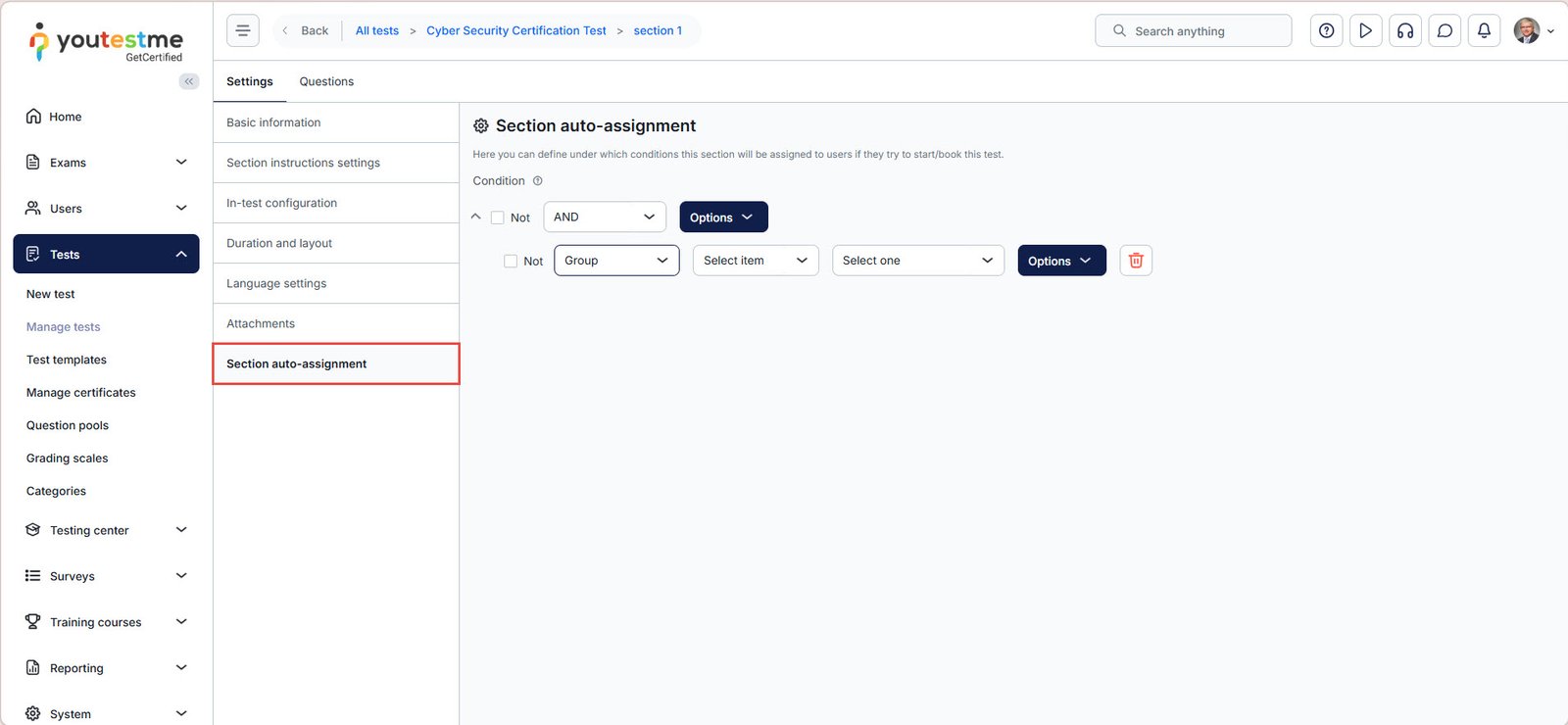 For example, if a section mandates membership in a particular user group according to predefined criteria, the user will only be able to access that section in the test if they belong to the group meeting those conditions. This flexible approach allows for precise control over section access, ensuring that users meet the necessary criteria for entry.