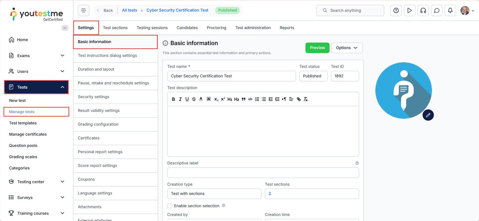 - Lock testing session – if this option is enabled, the candidates can start the test within this session only after entering the password.