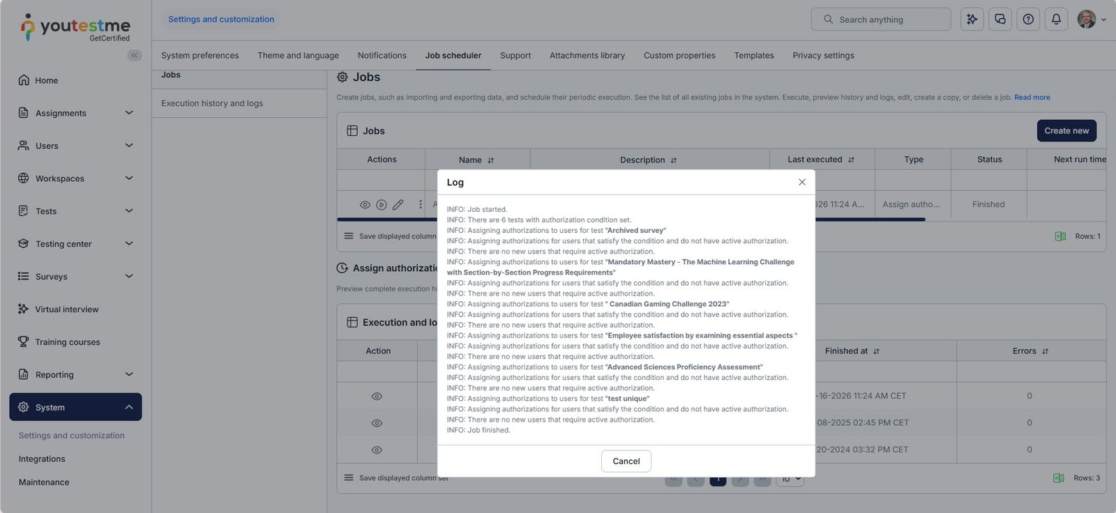Select the Assign authorization job or create a new one and execute it. Select the Execution history and logs tab and the preview button to preview the log of the executed job. You can find information that contains the number of users that satisfy the condition.