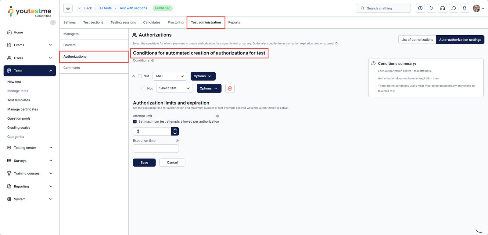 Another method to establish section conditions is through the Test Administrators/Authorizations tab. You will find a checkbox labeled Enable conjunction of section conditions. When activated, the conditions of all sections will be linked to this test authorization condition and cannot be manually altered. If conditions are set via the Authorizations tab, executing the system job is necessary for specific candidates to access designated sections.
