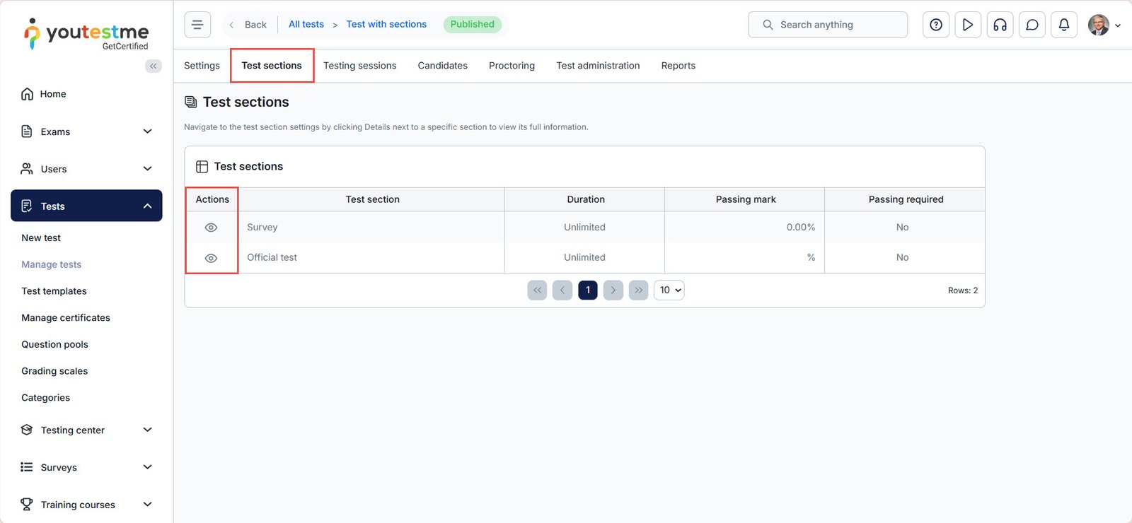 To set section conditions, select the Test sections tab and click the Details button in the Actions column.