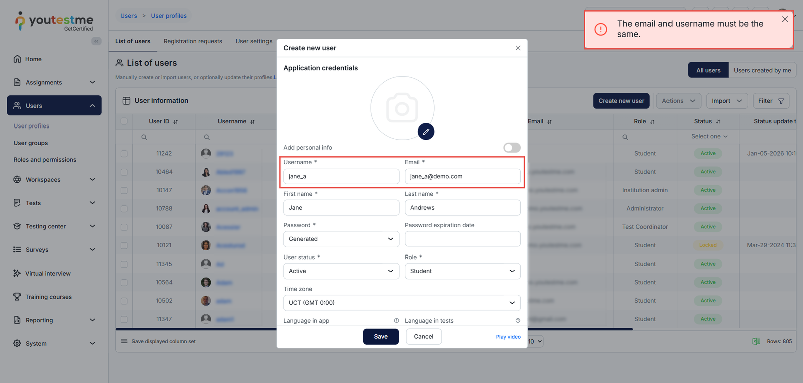 If an administrator attempts to create a user without using the email address as the username, the system will display an error message. This behavior applies to all methods of user creation.