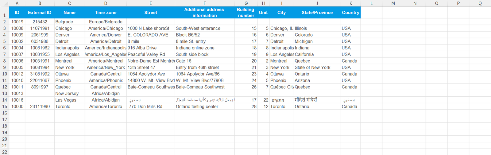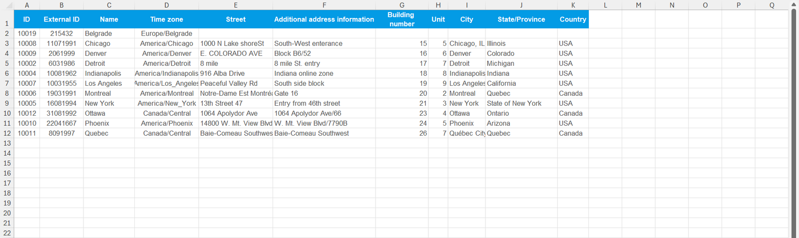 Open and preview the report that contains the testing locations, IDs, external IDs, and time zones associated with locations.