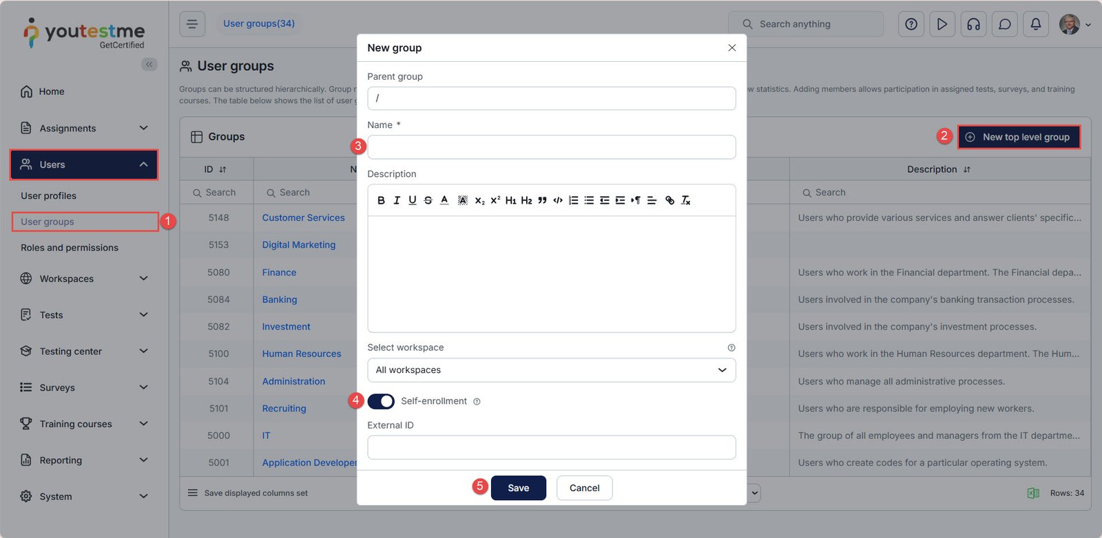 To enable the self-enrollment option for user groups and allow direct enrollment to the group via a link, follow these steps: