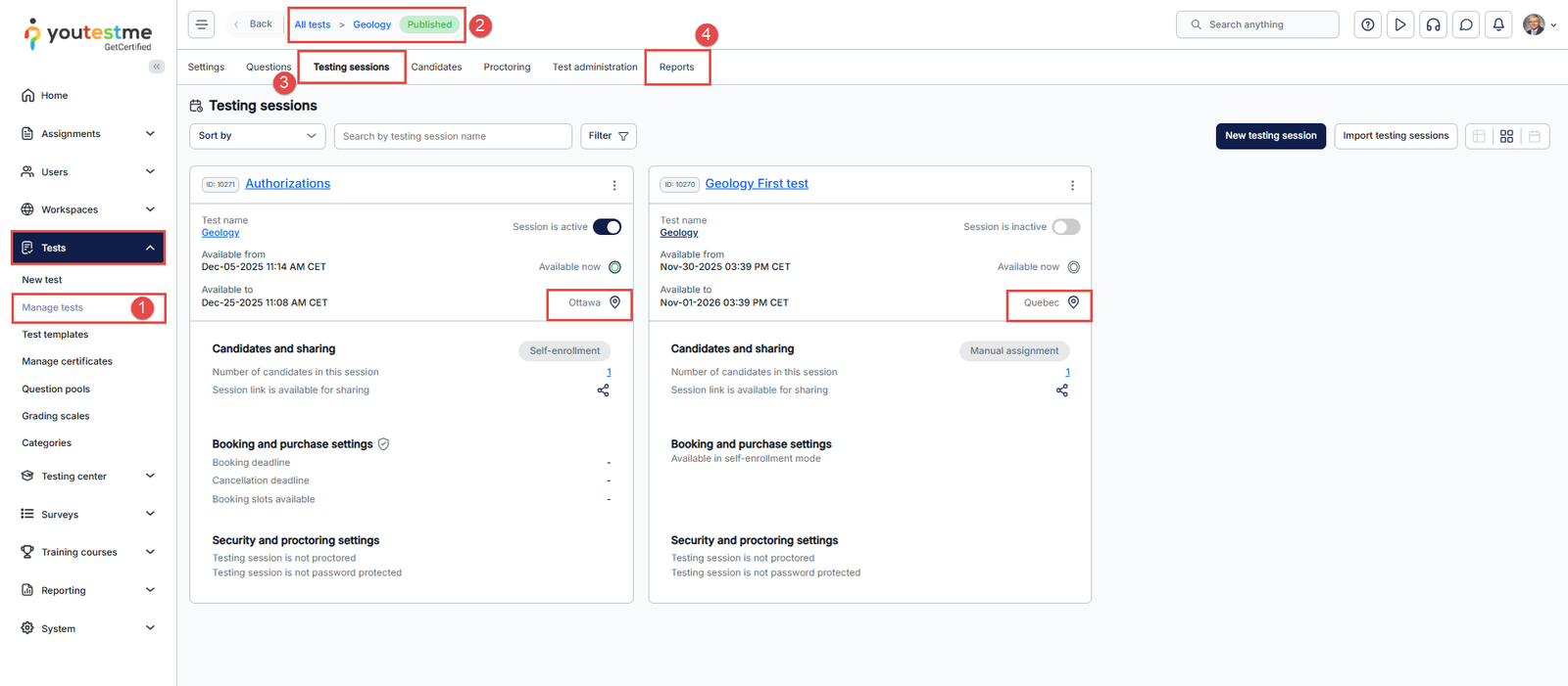 Note: Users will only be able to see the tests they manage, and only if they have the 53. Access Report Builder permission is enabled. Without this permission, no tests will be visible. - Click the Testing sessions tab to view all sessions associated with the test and identify which of them have assigned locations. This allows you to confirm where the report will source its location data.