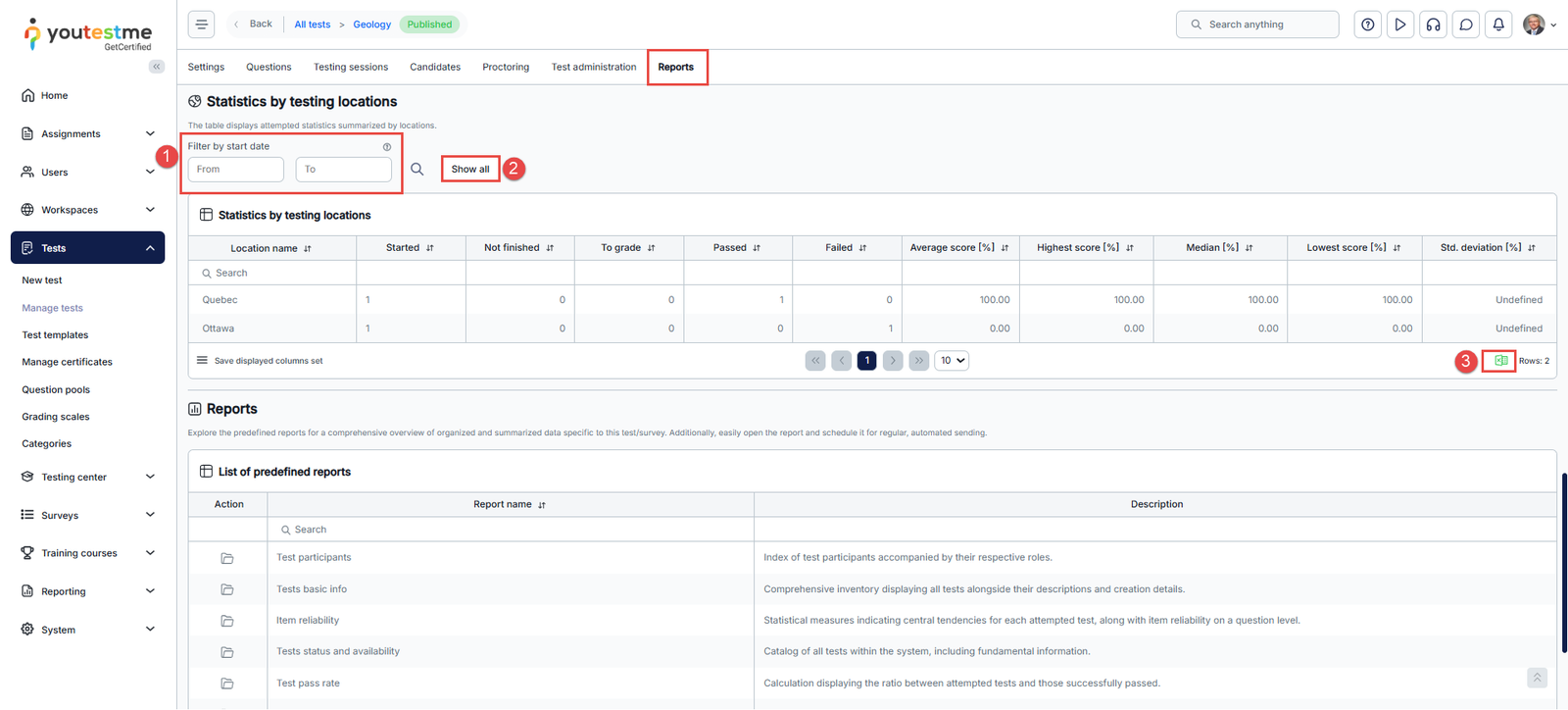 The Statistics by Testing Locations report provides a clear, concise overview of candidate performance by testing location. By utilizing filters and export options, test managers can effectively analyze trends, compare results across locations, and maintain organized records. This functionality is especially useful for institutions or organizations conducting assessments across multiple venues, ensuring informed decision-making and streamlined reporting.
