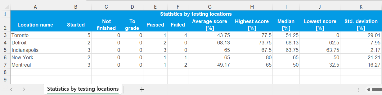 This report displays summarized statistics on test attempts, grouped by testing location. The table provides an overview of scores and metrics by test location.