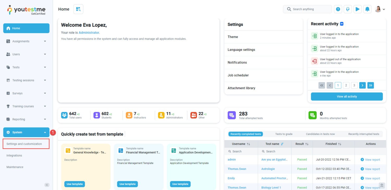- Click the “System” section in the left side menu, then choose the “Settings and customization” page.