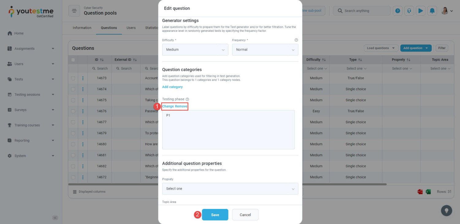 - Select the desired values of the question category, which will be used for filtering in the process of test generation.