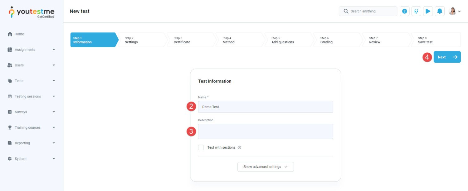 - Click the “Next” button to move on to the next step of the test creation wizard.