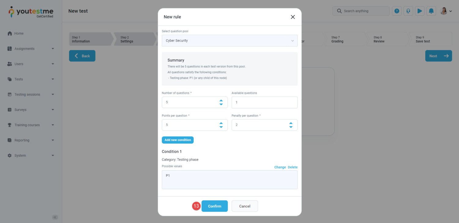 - Define the number of questions from the pool you want to be contained in the test.