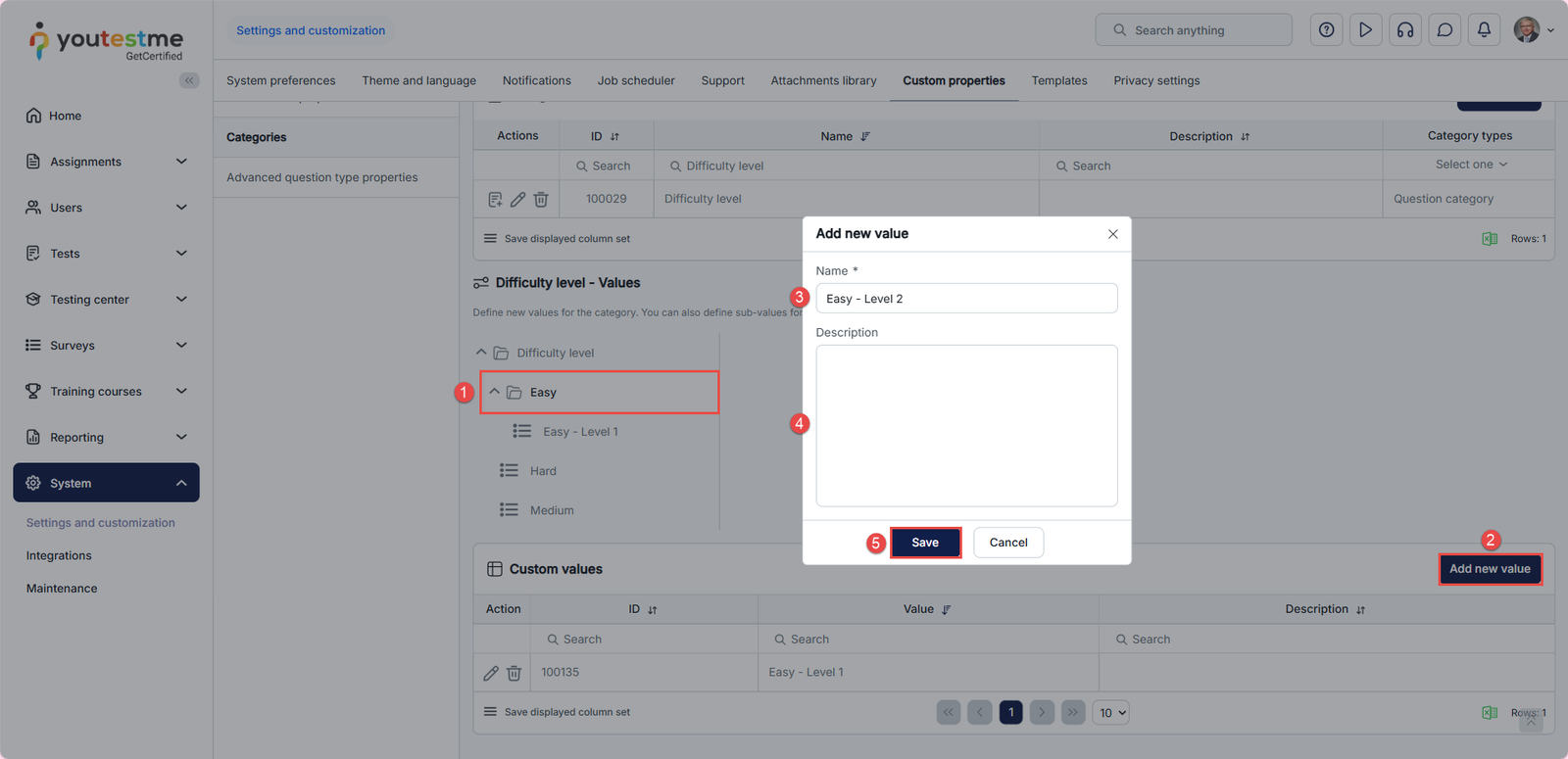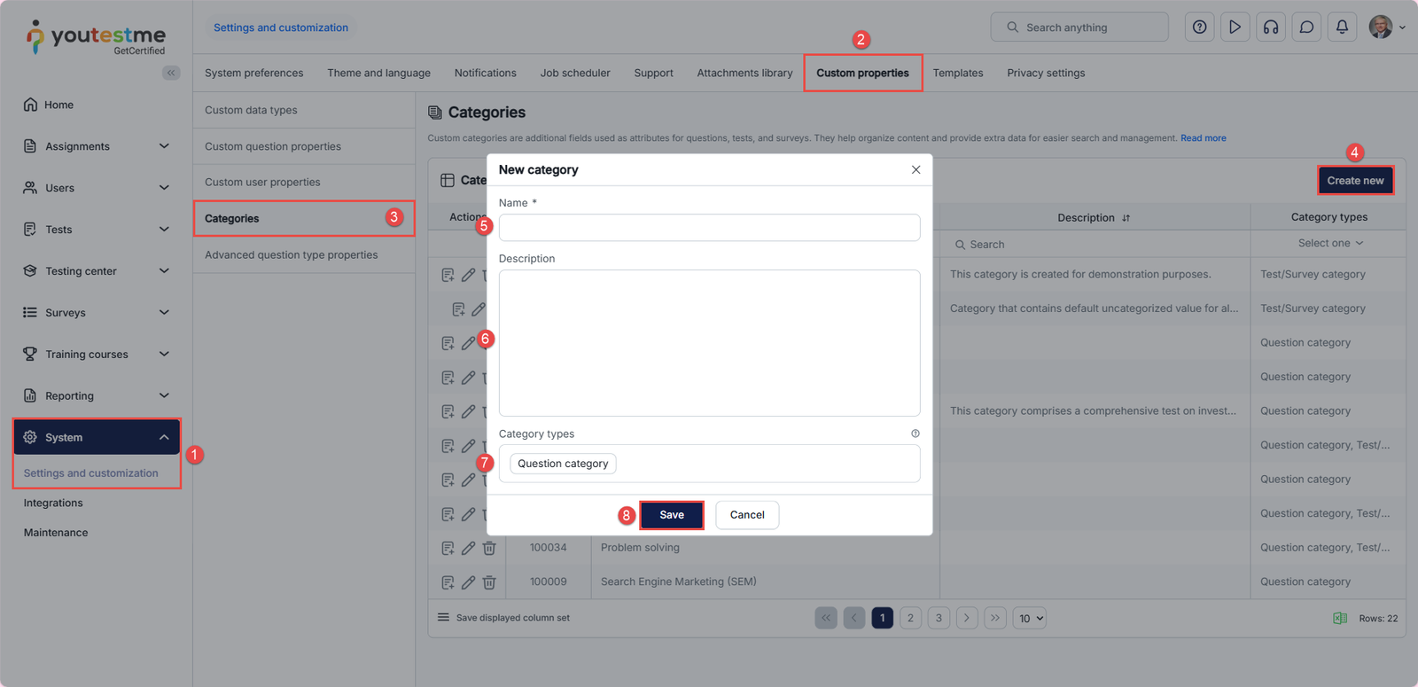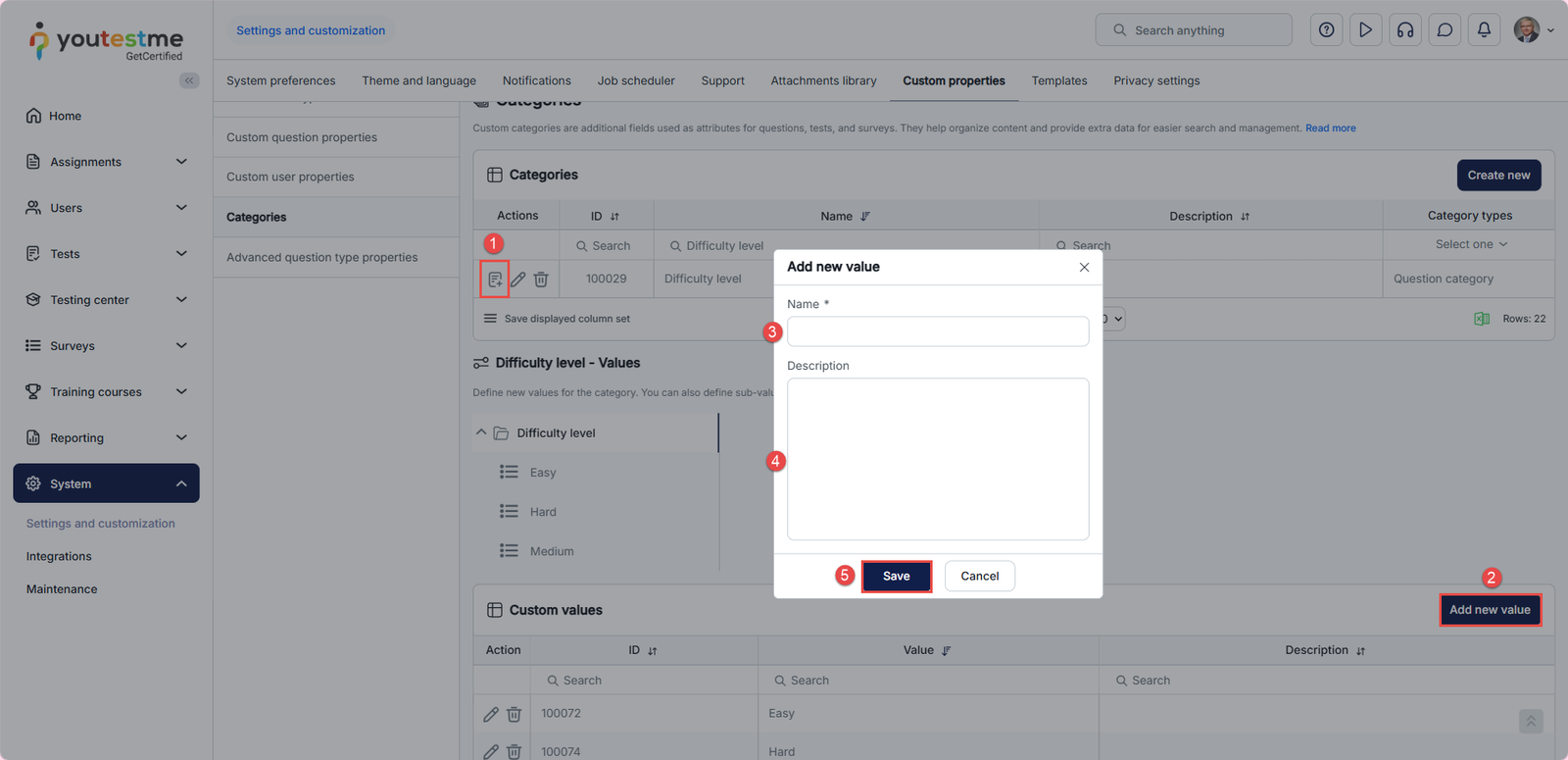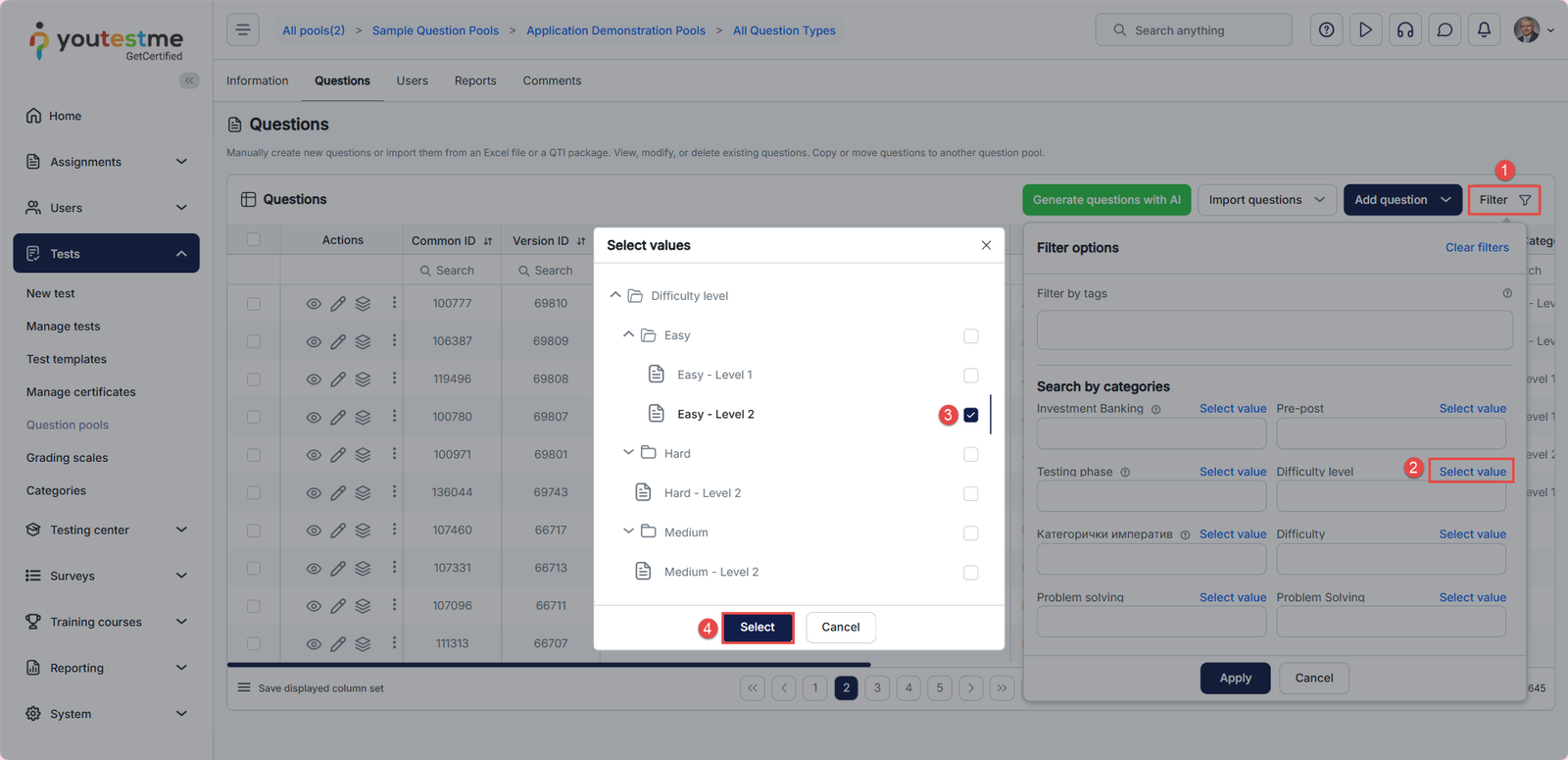 - Select the desired values of the question category, which will be used for filtering in test generation.