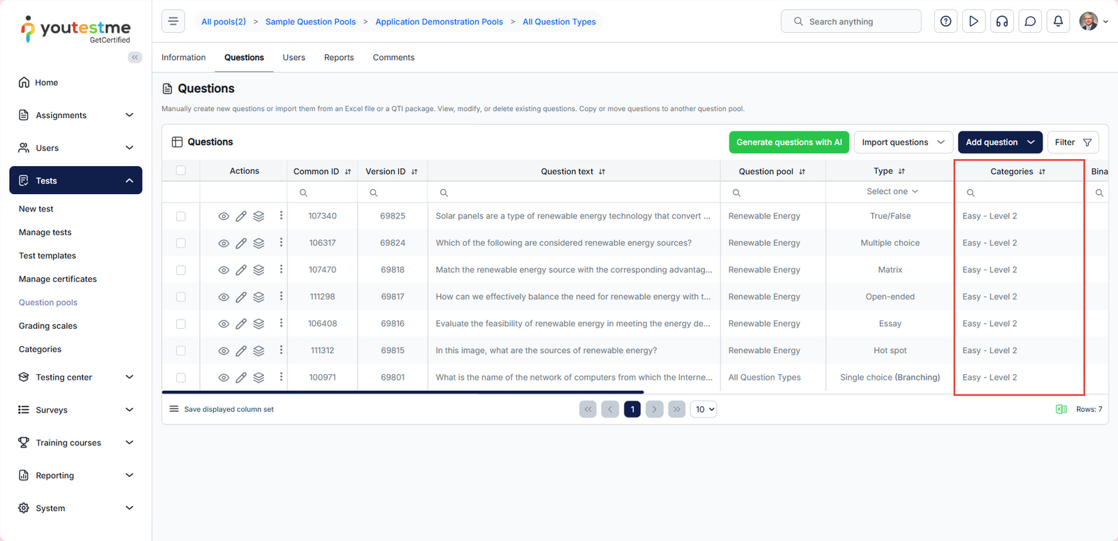 This article explains how to generate tests based on question categories that you previously created and assigned to test questions.