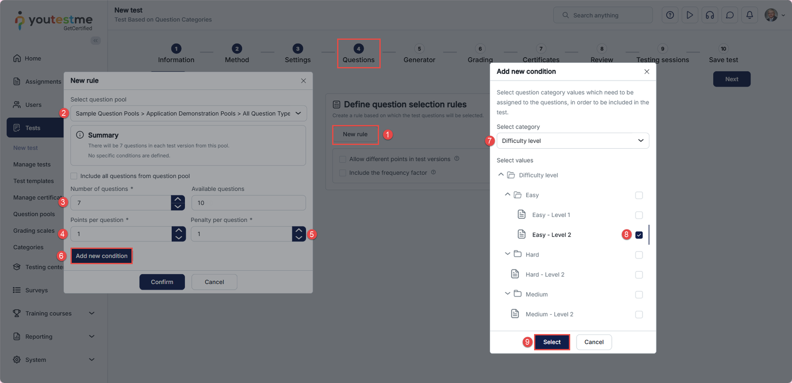 You will be presented with the number of available questions containing the defined condition. Once the condition is added, you will receive an in-app notification. Click the Confirm button to create a test rule. You can repeat the steps from 1 to 9 to define more test rules.