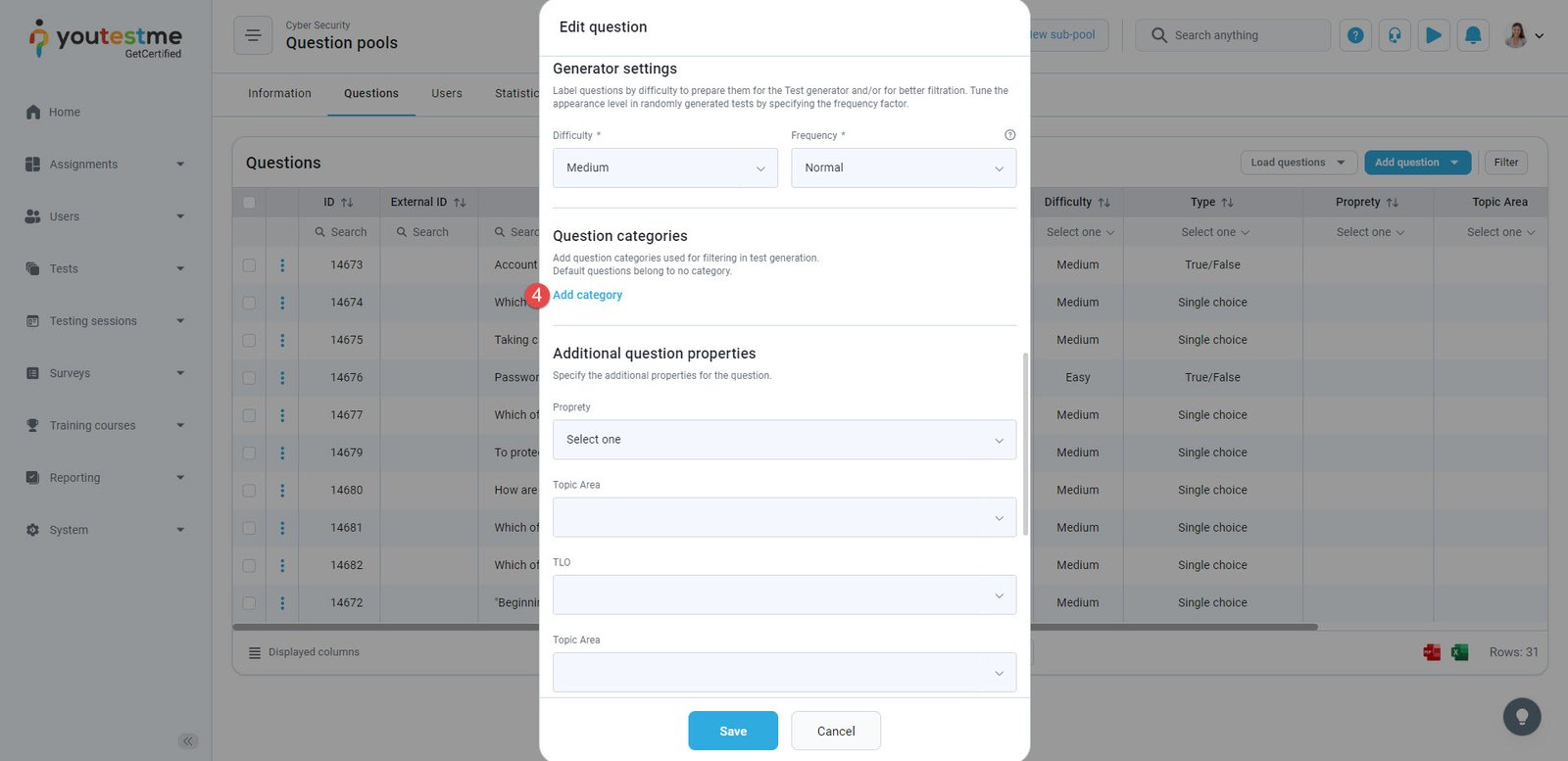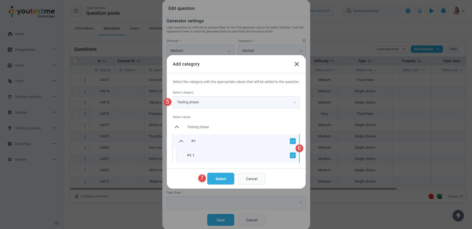 - Select the desired values of the question category, which will be used for filtering in the process of test generation.