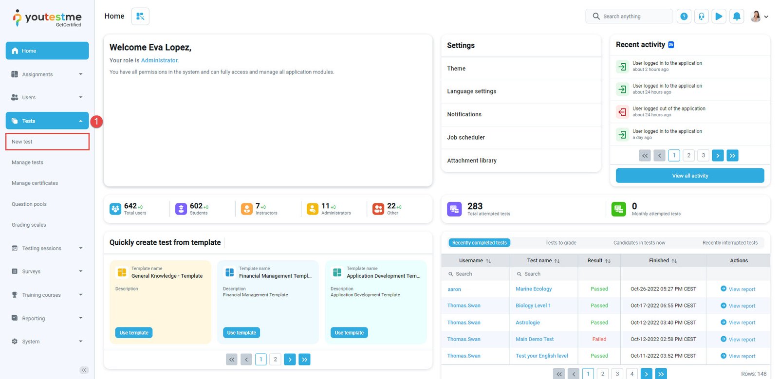 - Click the “Tests” section in the left side menu, then choose the “New test” page.