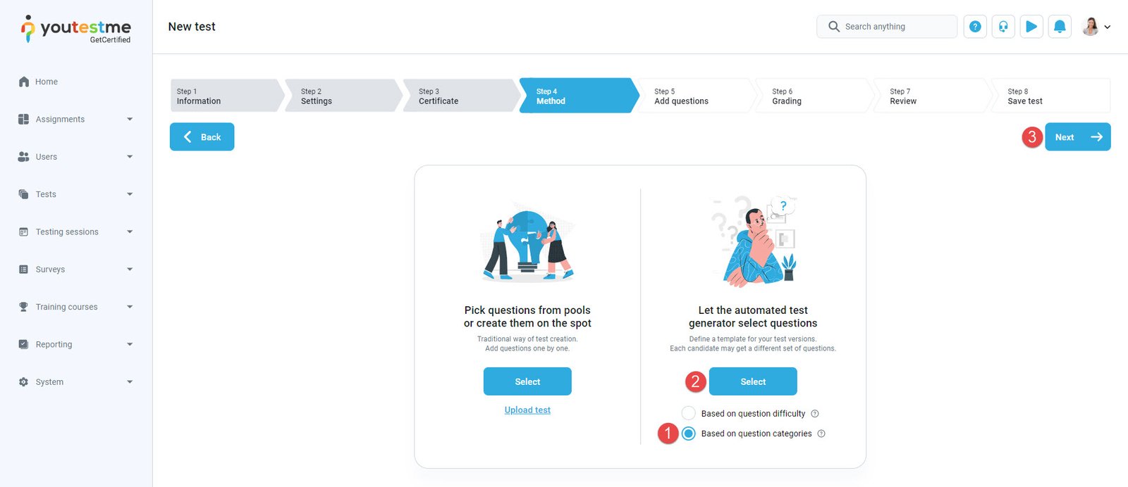 - Choose the “Based on question categories” method.