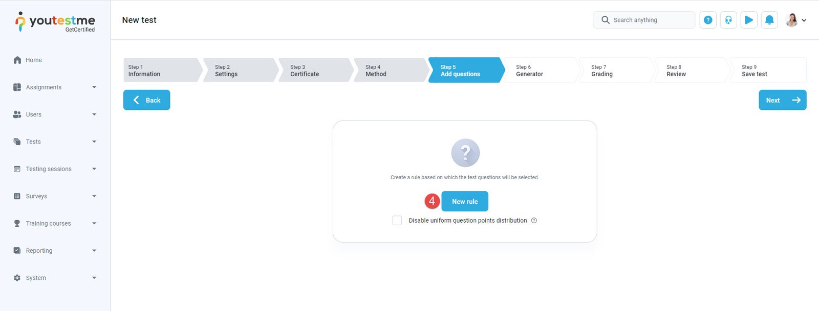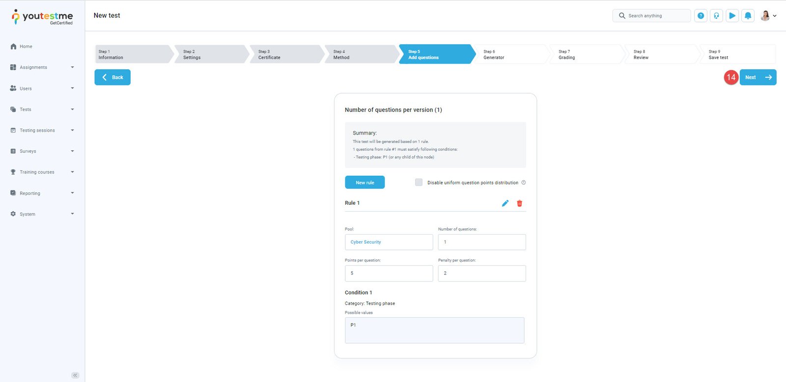 - Click the “Next” button to move on to the next step of the test creation wizard.