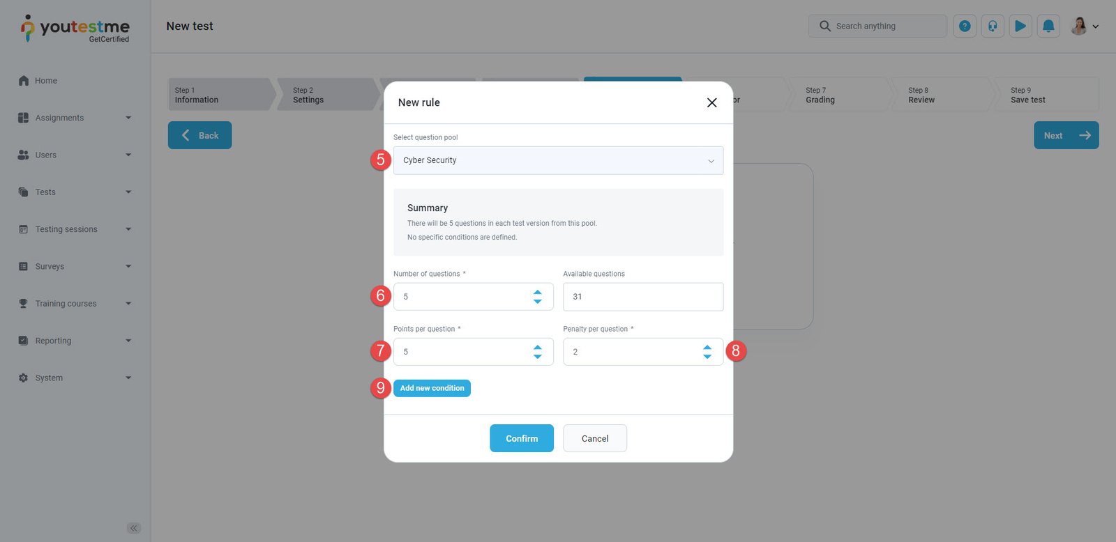 - Define the number of questions from the pool you want to be contained in the test.