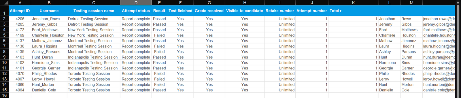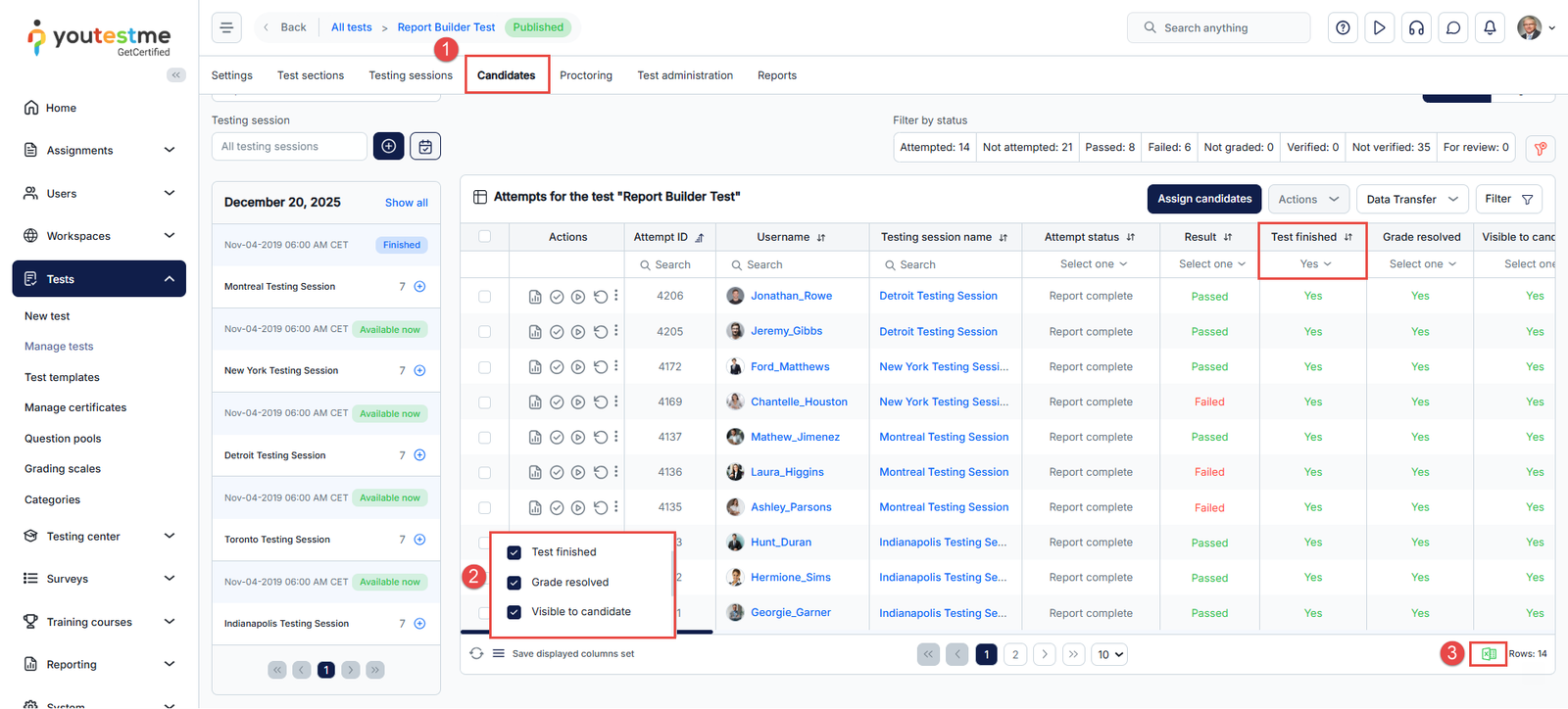 - Click on the icon to export the report. Only reports for the users filtered through the search will be downloaded. In this case, in the displayed column set, we selected the Test Finished filter and set it to Yes, which allows us to view the list of users who have taken the exam.