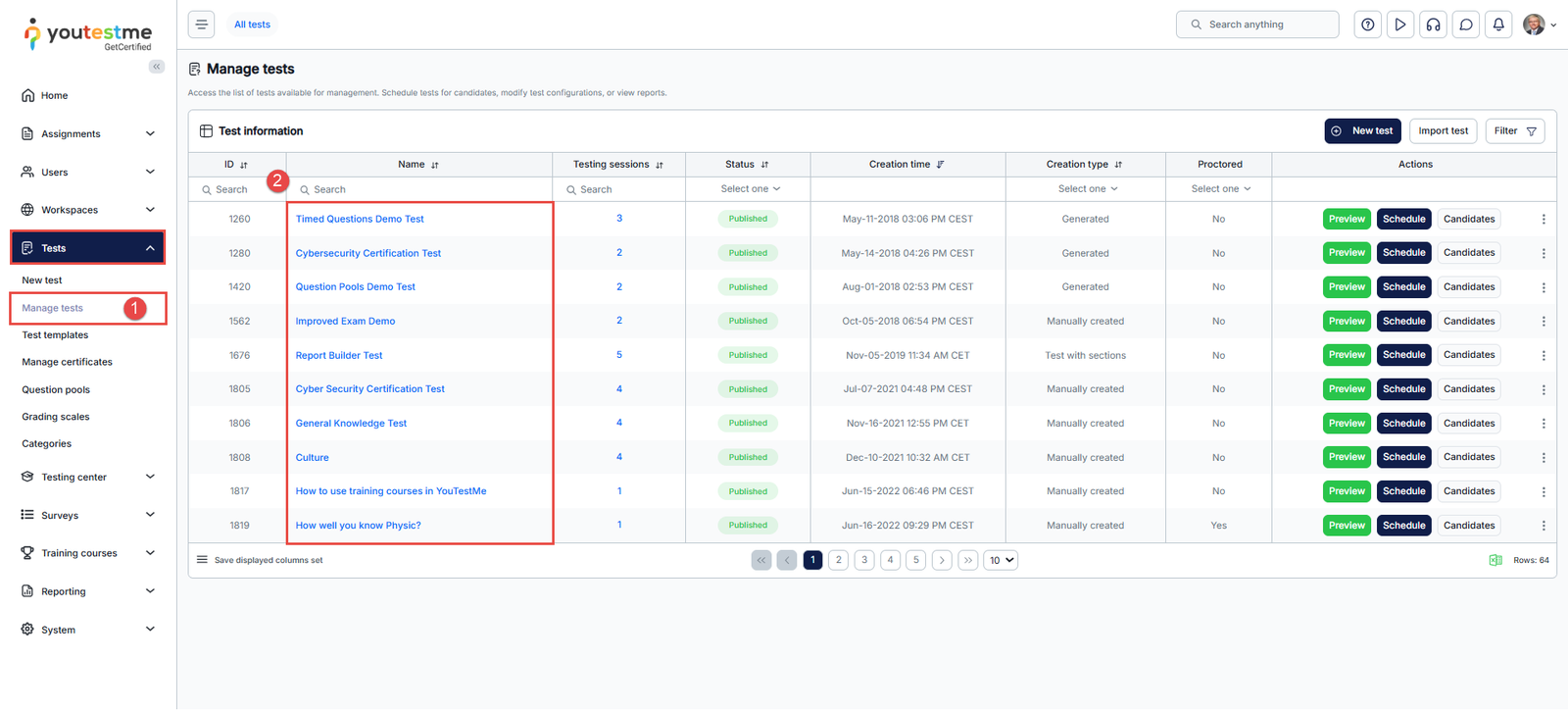 - From the home page, select the Tests tab in the left-side menu and then the Manage tests tab.
