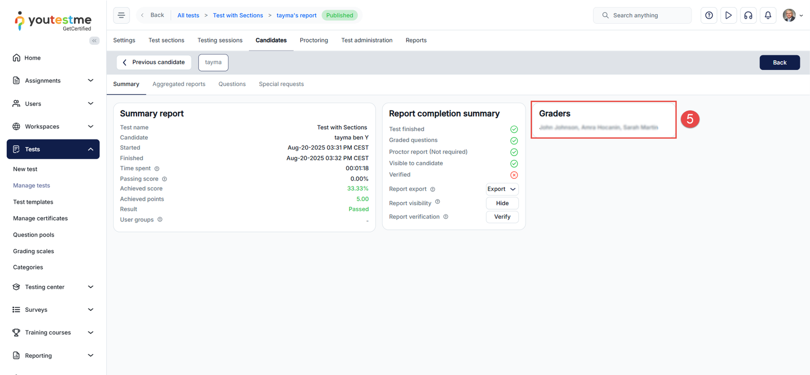 - Click on the desired test name and go to the Candidates tab.