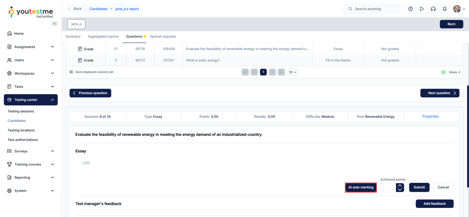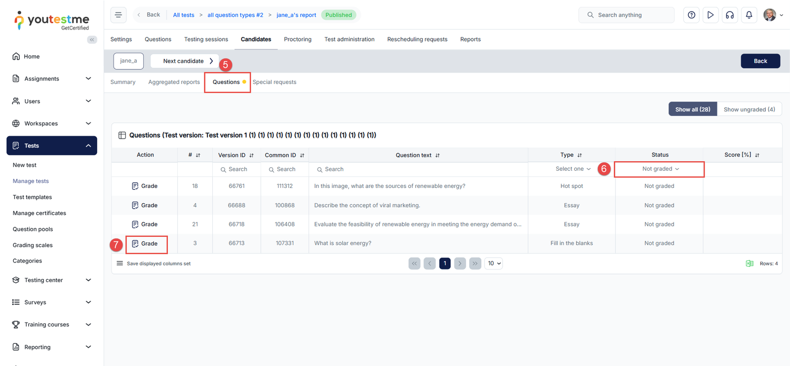 This article explains how to grade a test attempt manually in the YouTestMe system. Grading allows authorized users to evaluate candidate responses, assign scores, and provide feedback where automated grading is not possible.